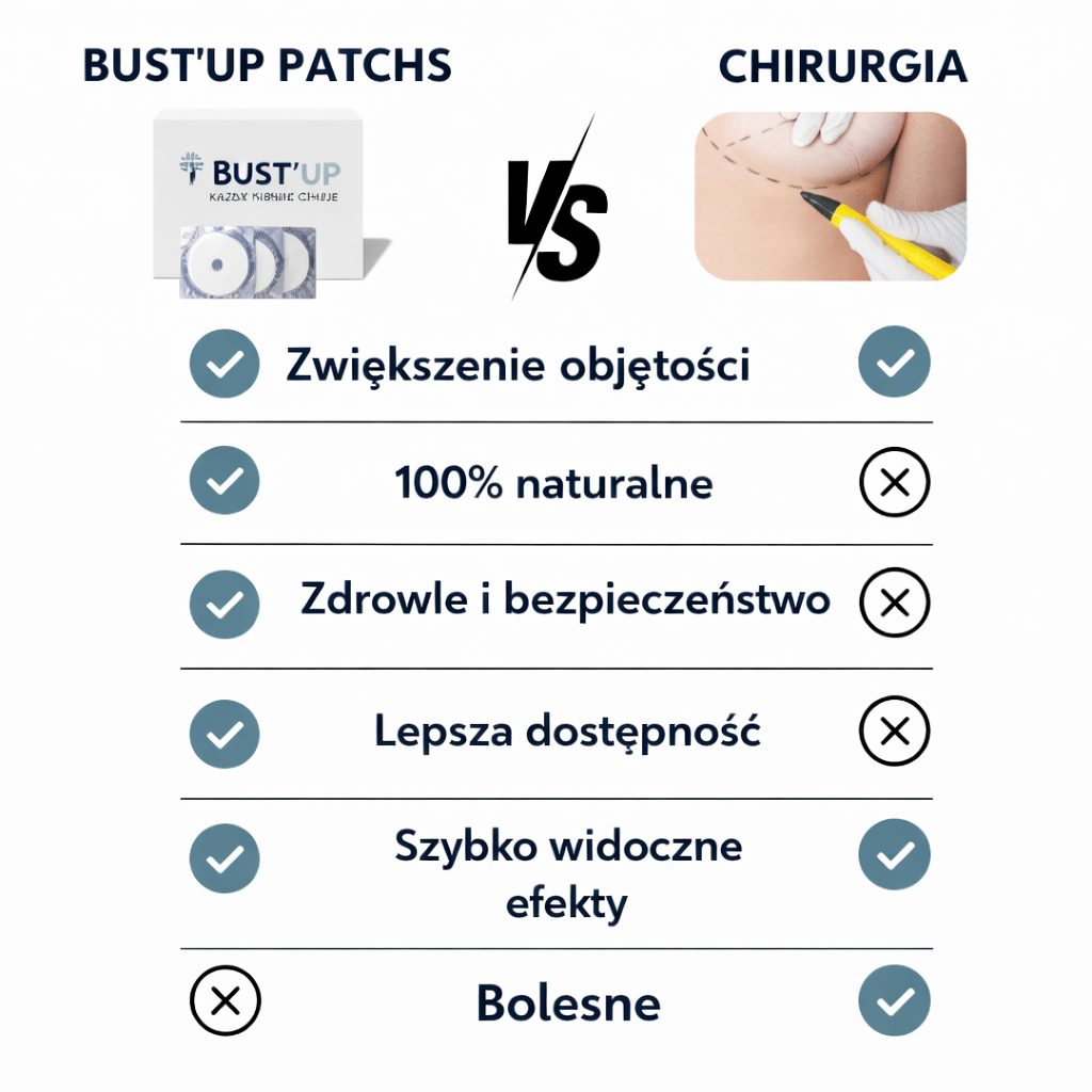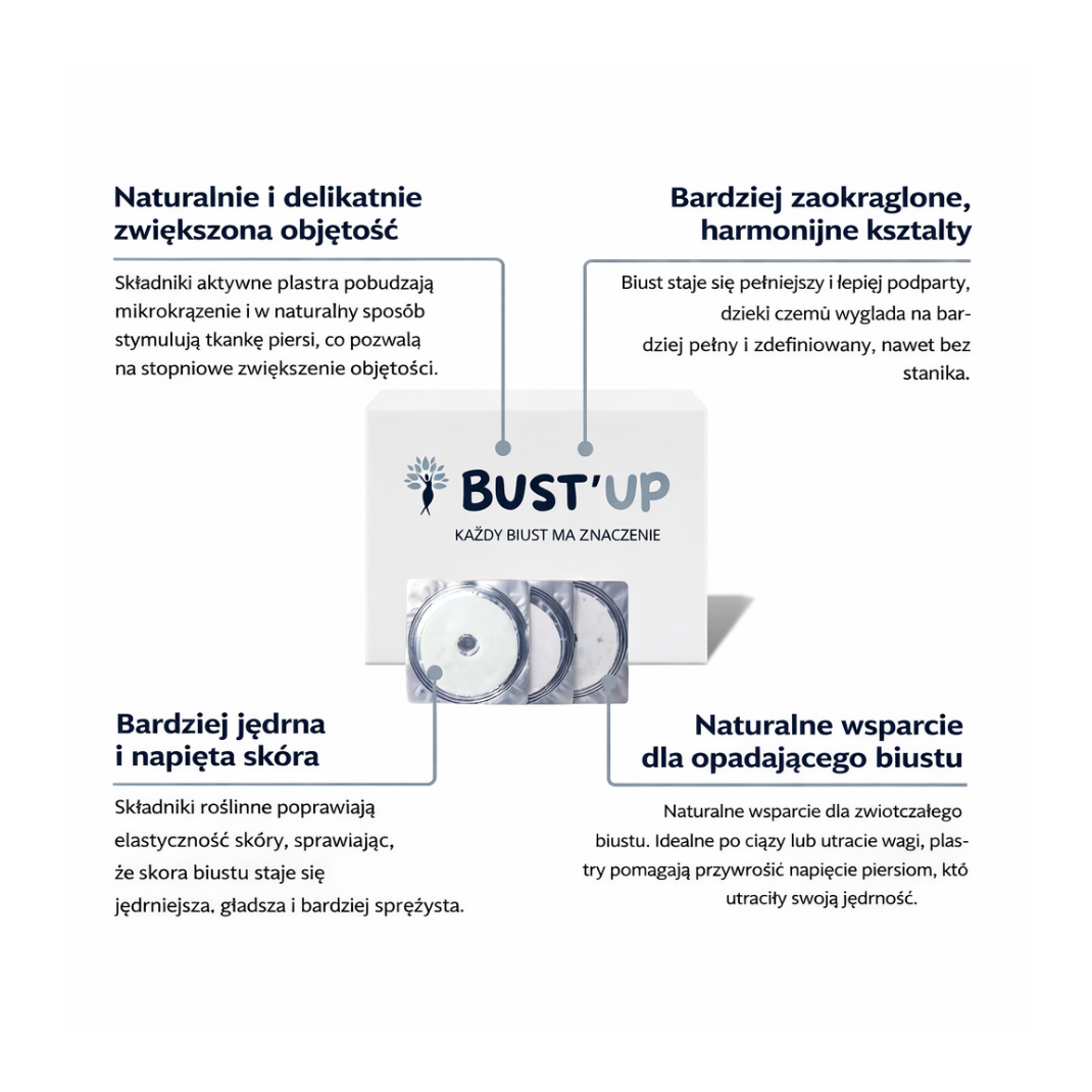 całkowicie bez bólu, ryzyka i wysokich kosztów. W przeciwieństwie do zabiegów chirurgicznych plastry Bust’Up oferują w 100% naturalne, stopniowe rozwiązanie